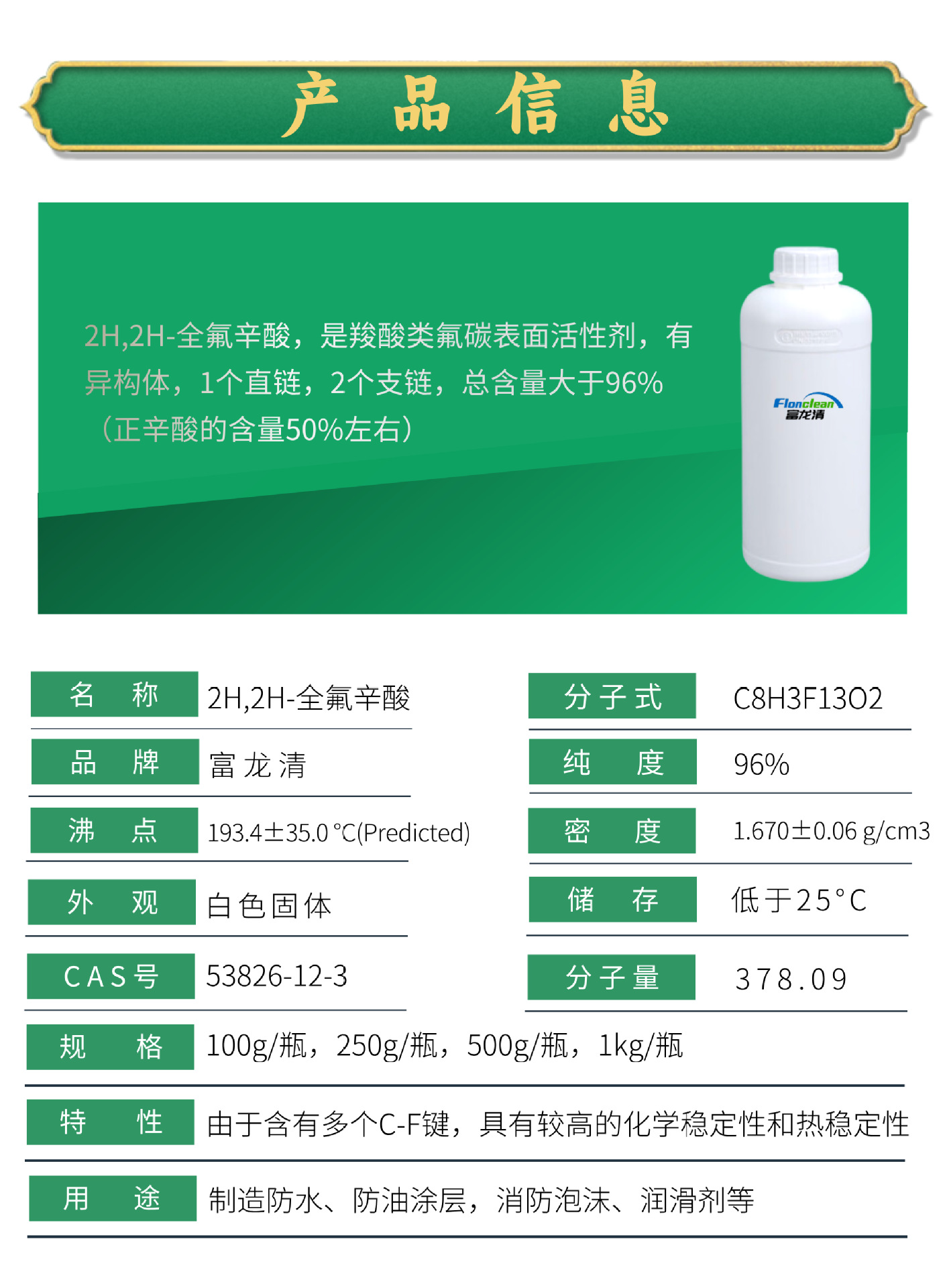 分子式:C6F13CH2COOH 2H,2H-全氟辛酸的结构与全氟辛酸类似,但在分子链的两个末端碳原子上各保留了一个氢原子,而不是完全被氟原子取代。